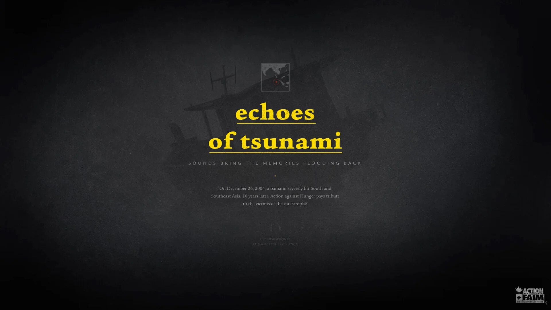 Aujourd'hui je vous parle d'une cause importante pour laquelle je me suis impliqué en collaboration avec l'agence 84.Paris : la commémoration des 10 ans du Tsunami en Asie du Sud et du Sud-Est. En effet rappelez-vous il y a dix ans, le 26 décembre 2004, un terrible tsunami ravageait les côtes d'Asie du Sud-Est et un raz-de-marée faisait plus de 220 000 morts. Si aujourd'hui les impacts de cette tragédie sont plus ou moins effacées, c'est grâce aux efforts d'ONG comme Action Contre la Faim qui ont aidé, reconstruit, soigné les victimes et habitants de ce drame. Aujourd'hui pour cette ONG nous lançons une véritable opération web appellée "Echoes of Tsunami" sous forme d'une expérience digitale pour nous souvenir de ces moments durs et de rappeler les choses faites par Action Contre la Faim.