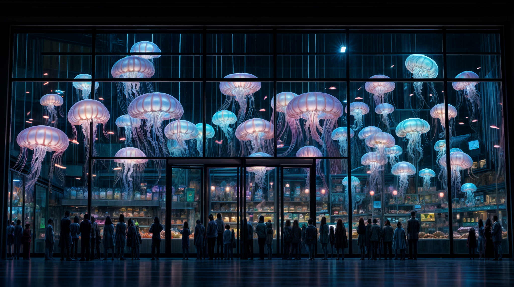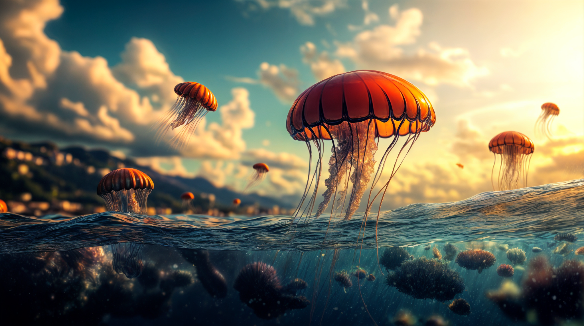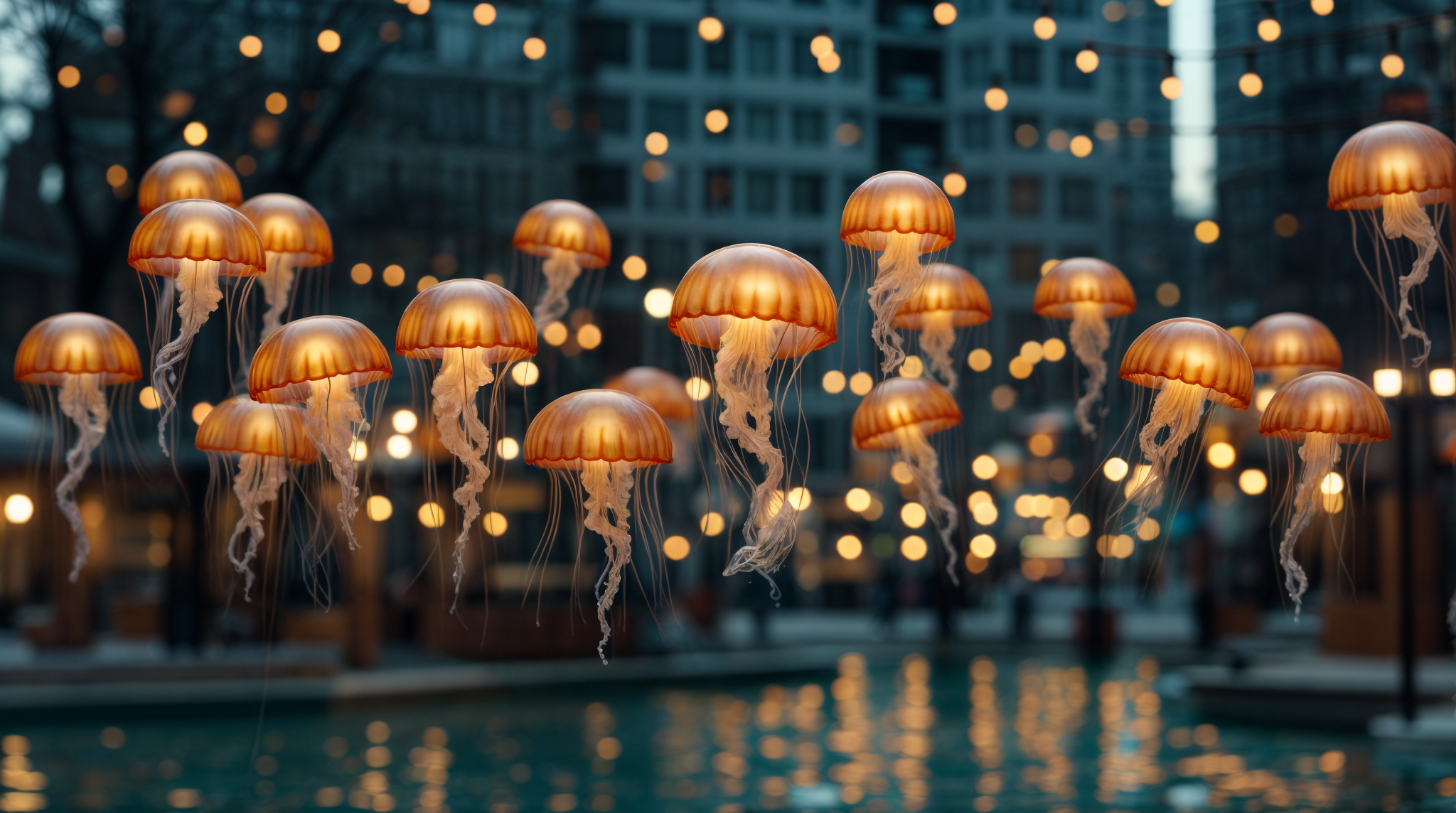 Prompt: The image depicts four glowing jellyfish floating in an urban environment with tall buildings and lights in the background. The jellyfish have a translucent appearance with orange and white colors, creating a striking contrast against the dark, cloudy sky.