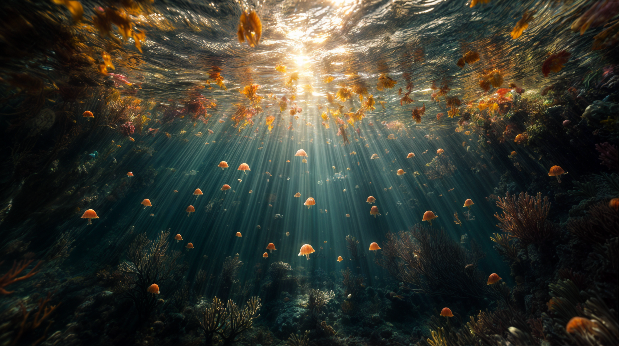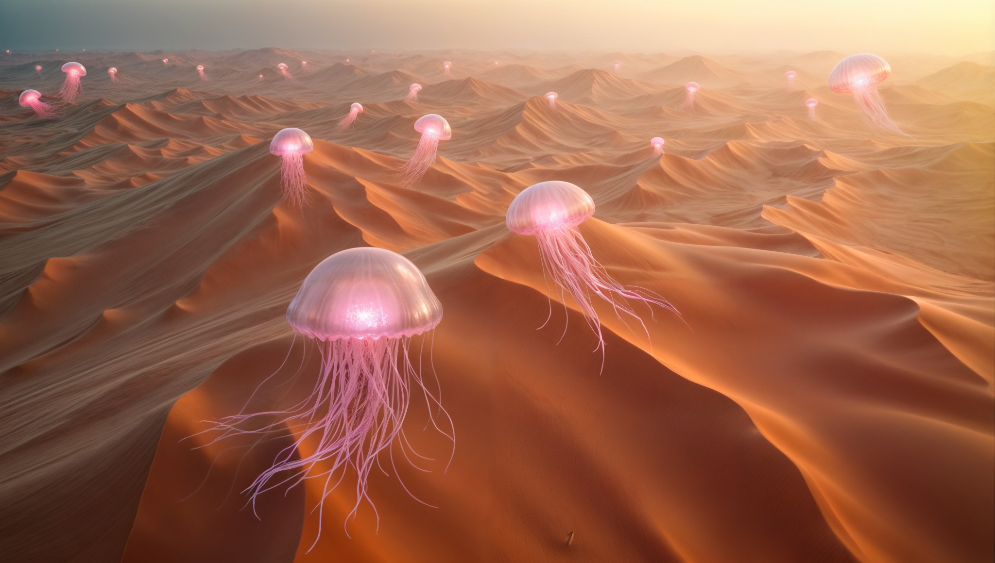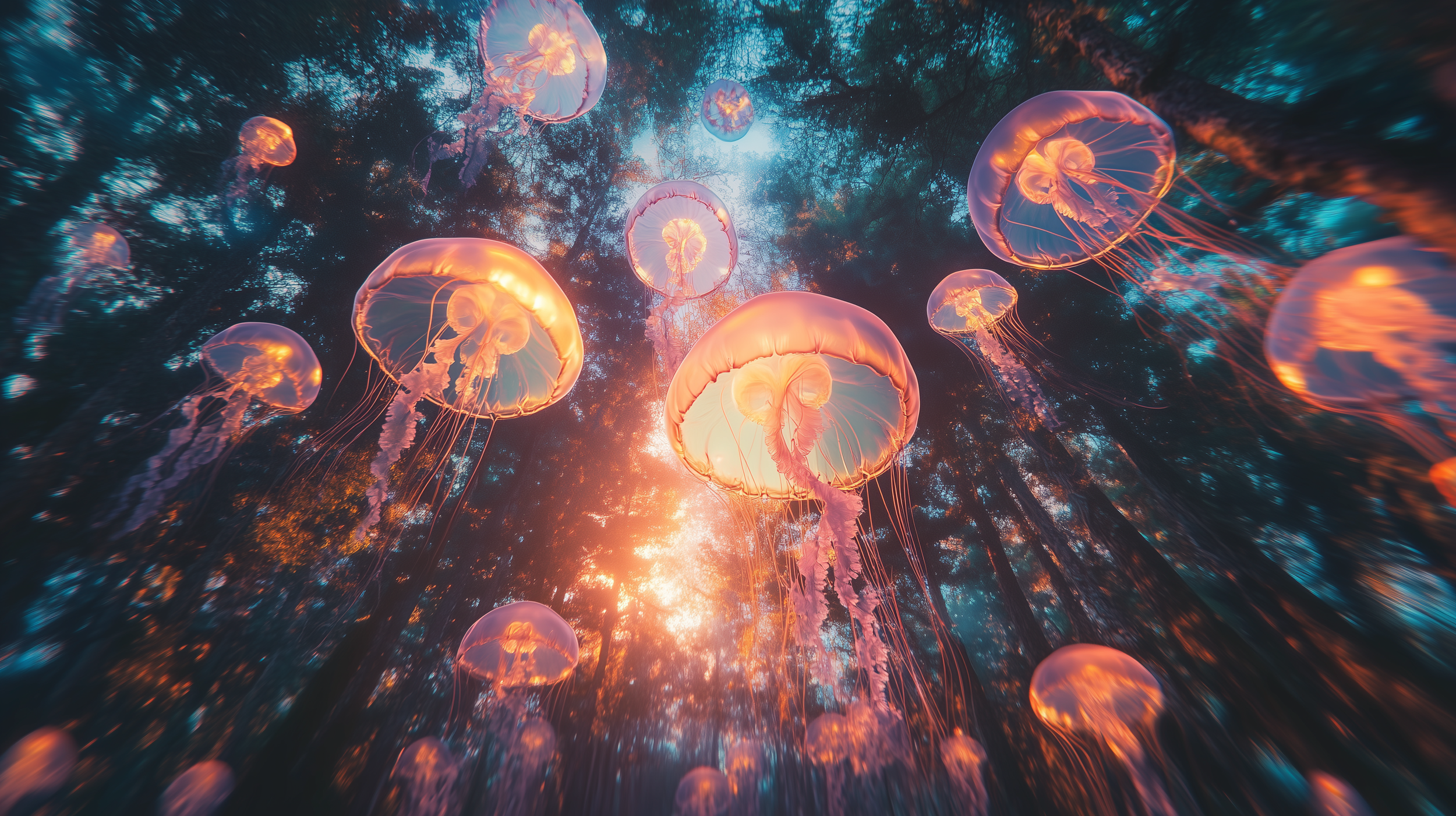 L’utilisation de l’intelligence prenait alors tout son sens, avec des plans de méduses volantes dans différentes parties du monde, plans qui seraient difficiles à réaliser autrement… Je me suis éclaté à créer librement toutes sortes de méduses dans des environnement naturels de plus en plus différents et je savais que mêlé à la musique très enveloppante, cela donnerait un effet très planant et poétique…